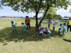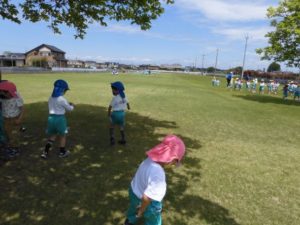 お友だちみんな柊 園庭芝生に 春の探検に出かけました。